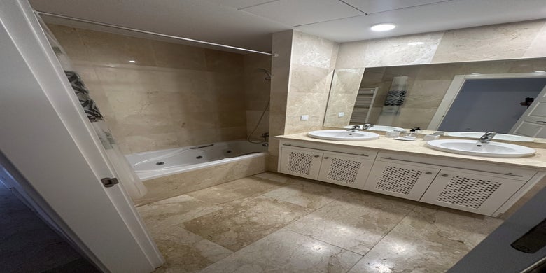 - The master bedroom has a double bed, built-in wardrobes, and an en-suite bathroom with double sink, bathtub, and toilet.