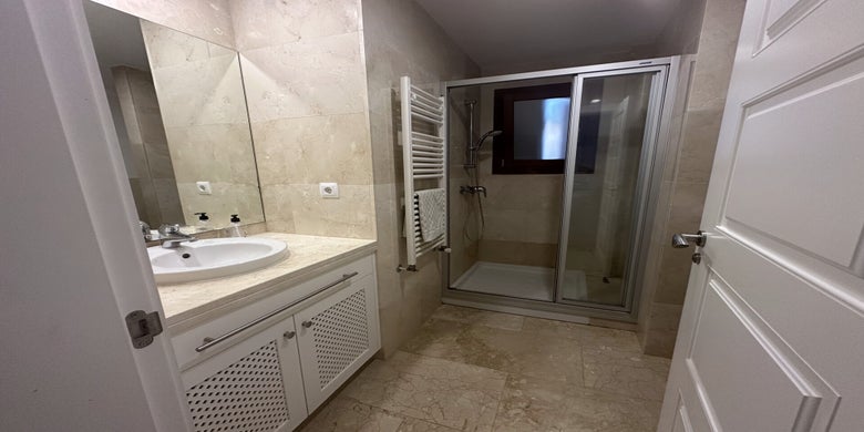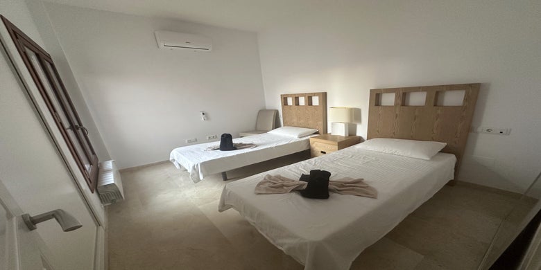 - The second and third bedrooms have two single beds and built-in wardrobes. Adjacent bathroom with shower, sink, and toilet.